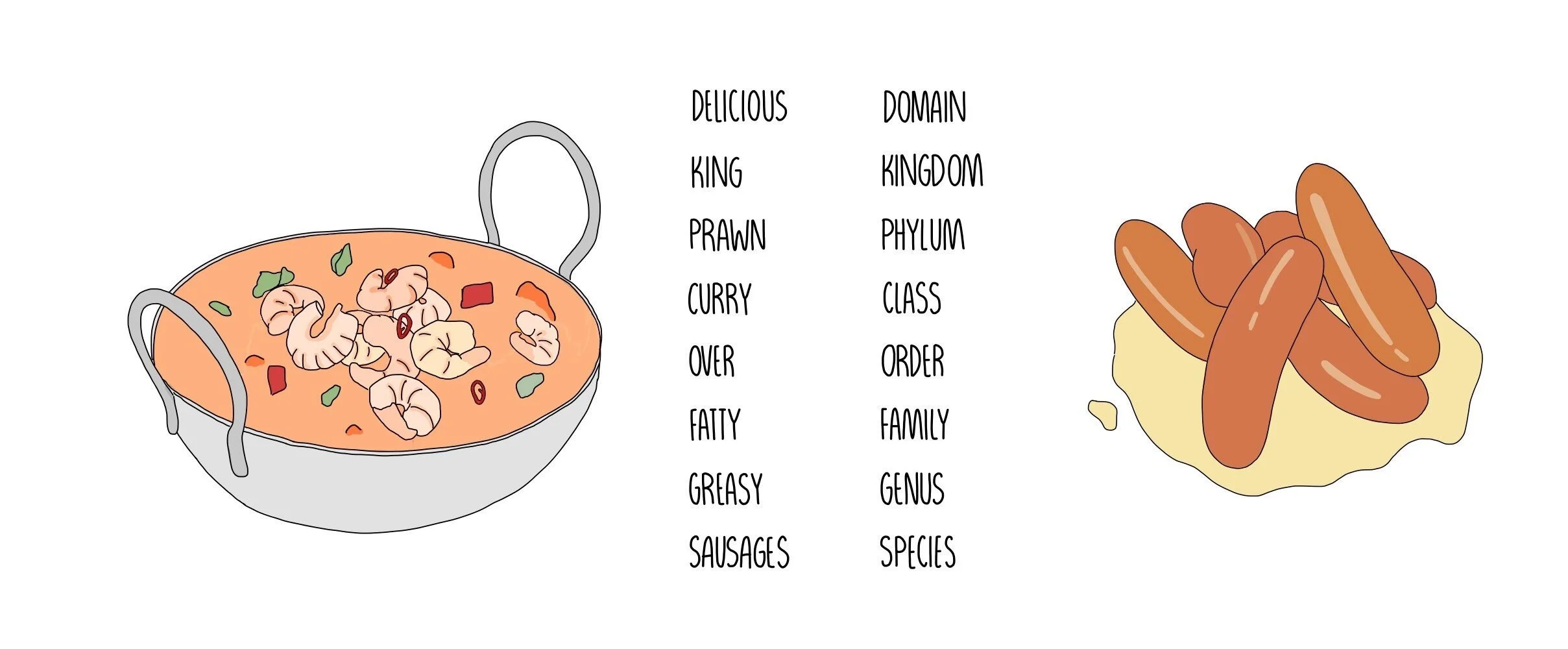 It’s useful to use a mnemonic to help you remember the order of the taxonomic groups. The classic one is ‘Dear King Phillip Came Over For Good Soup’ but my favourite is ‘Delicious King Prawn Curry Over Fatty Greasy Sausages’.