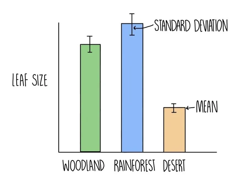 You can then plot the variation in phenotypes on a graph. You may wish to add error bars to represent standard deviation. Standard deviation is a measure of the spread of values about the mean. Error bars extend one standard deviation above and one standard deviation below the mean, so the total length of the error bar is twice the standard deviation. The larger the error bar, the greater the amount of variation in the data.