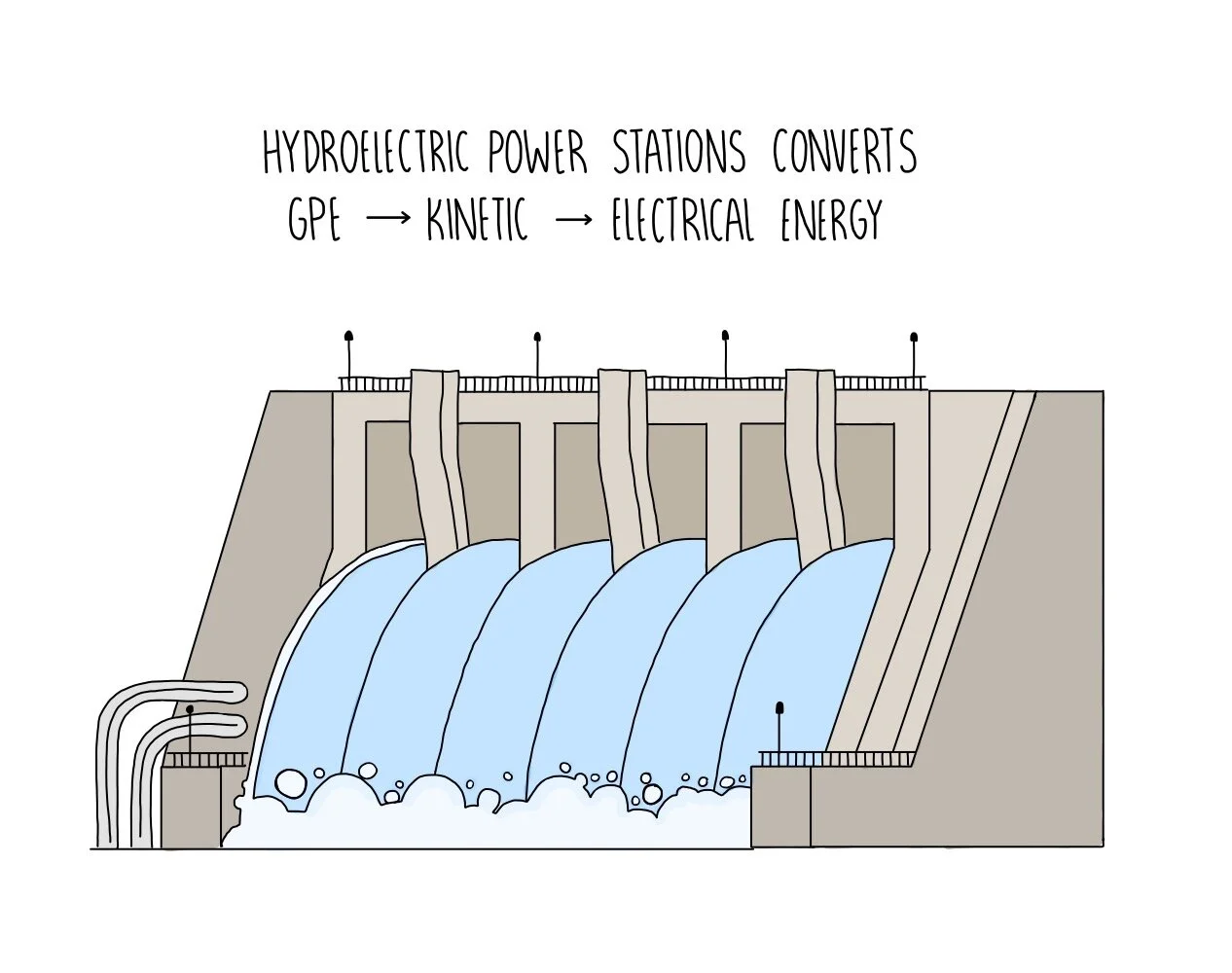 Kinetic energy can be harnessed from the movement of waves or tides and used to drive a generator. Hydroelectric power stations create gravitational potential energy by storing water in a dam. When the water gushes through the tubes inside the dam, the gravitational potential energy is converted into kinetic energy which is used to drive a generator. Like wind energy, no polluting gases are produced and there are no fuel costs. It is more reliable than wind energy since tidal movements and waves are constant. The disadvantages of water energy are that they can only produce small amounts of energy at a time and can cause habitat destruction along coastal regions.