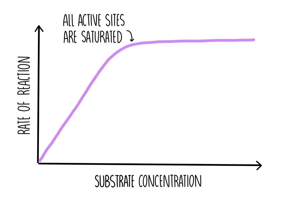 As substrate concentration increases, the rate of reaction increases since there are more substrate molecules to fill the enzyme’s active sites. There will be more frequent collisions so more formation of ES complexes. At some point a ‘saturation’ point is reached where all of the enzyme’s active sites are occupied with substrate molecules, so the addition of more substrate molecules will have no effect on the rate of reaction. At this point, the reaction is proceeding as fast as possible, which is referred to as Vmax. The only way the reaction can go any faster is by increasing enzyme concentration.