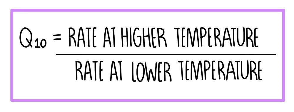 When Q10 = 2, the rate is doubling for every 10oC increase in temperature. When Q10 = 3, the rate trebles for every ten degree increase. Most enzyme-catalysed reactions have a Q10 of around 2.