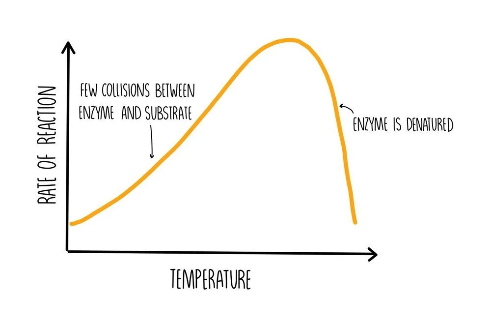 At low temperatures, the rate of reaction will be slow because the enzyme and substrate have low amounts of kinetic energy. This means that there won’t be many collisions so there will be reduced formation of ES complexes. As the temperature is increased, the number of collisions increases, increasing the formation of ES complexes and increasing the rate of reaction. If the temperature becomes really high, hydrogen bonds will begin to break within the protein, causing it to unravel and become denatured. If enzymes are denatured, they lose the shape of their active sites which means they cannot bind to their substrate, decreasing the rate of reaction.