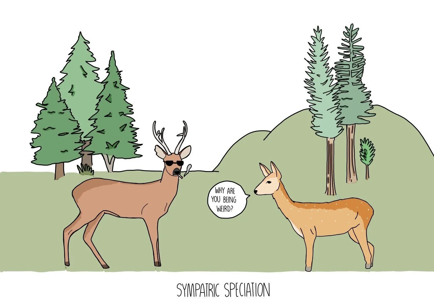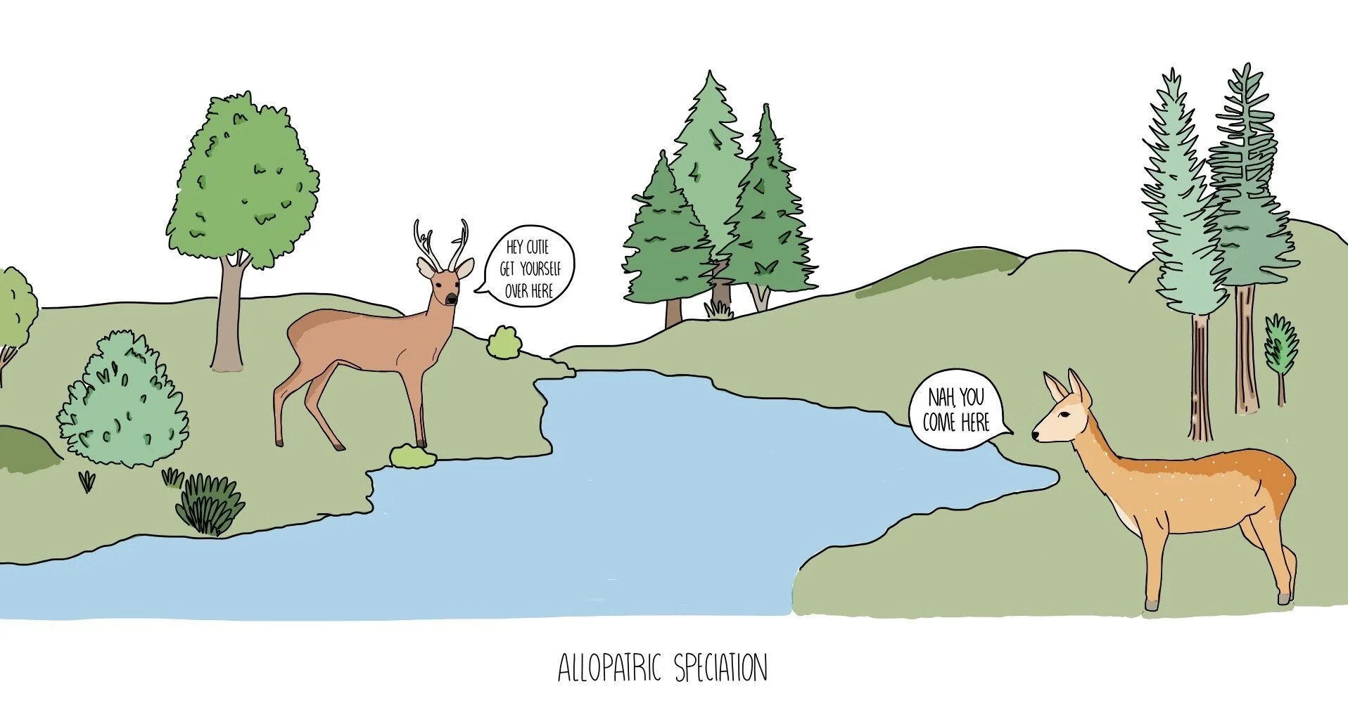 Speciation can be classed as allopatric or sympatric - allopatric speciation involves organisms becoming geographically separated from one another whereas sympatric speciation occurs in the absence of a geographical barrier.