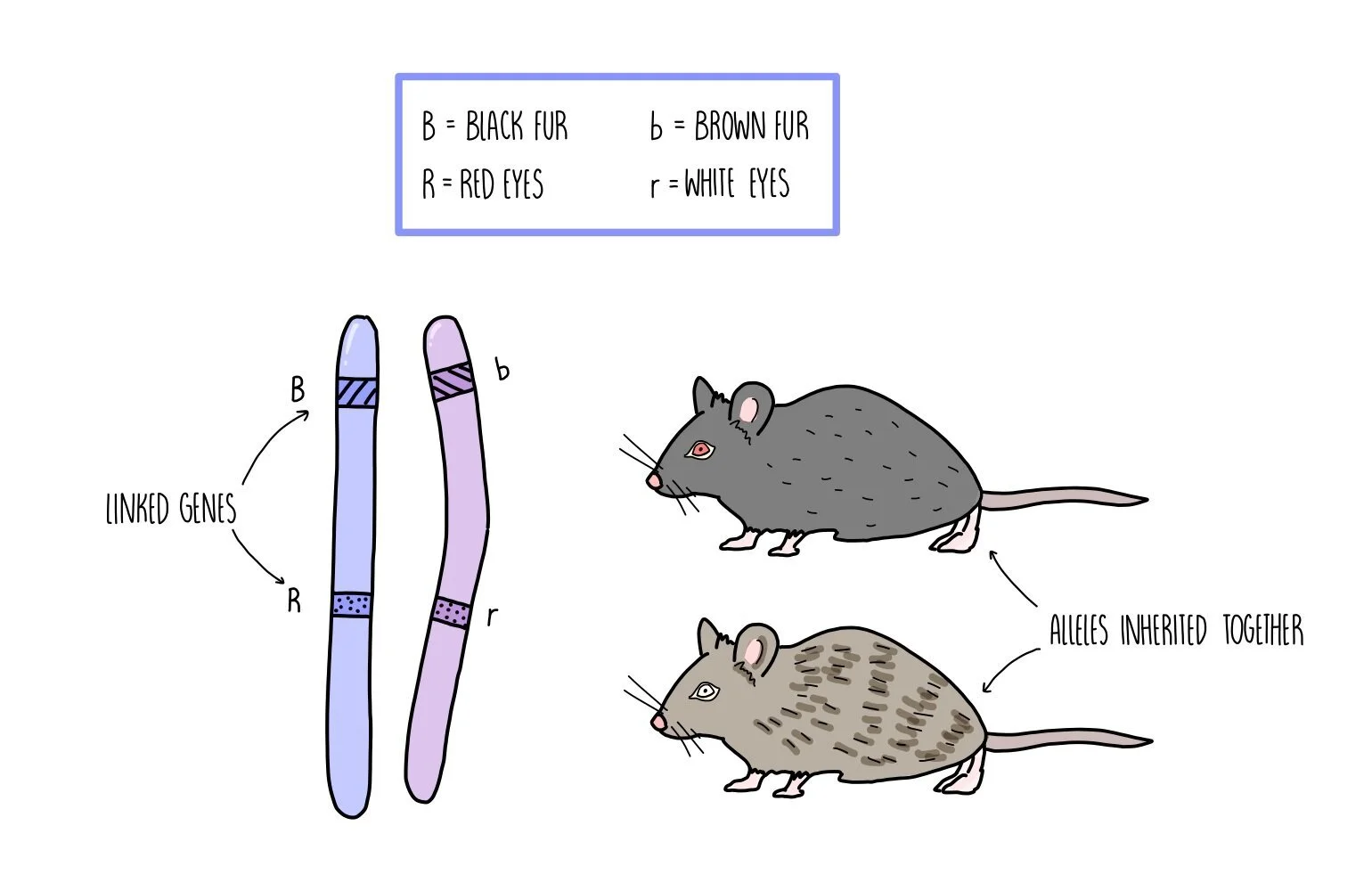 The image below shows an example of gene linkage in rats. If the genes for coat colour and eye colour are located on the same chromosome, they will be inherited together and the offspring will show both phenotypes together. For example, there will be rats with both black fur and red eyes, and with both brown fur and white eyes but not many with black fur + white eyes (or likewise, brown fur + red eyes). To get these combinations of phenotypes, crossing over must have occurred between the homologous chromosomes to cause the alleles to end up on the same chromosome and be inherited together.