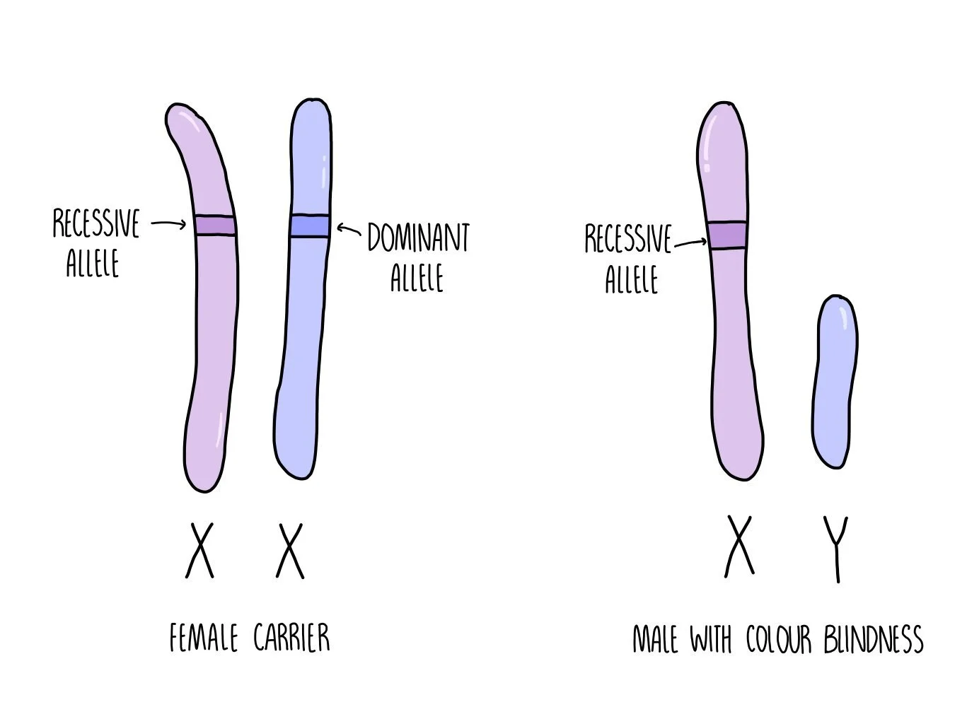 Genes which are located on one of the sex chromosomes (X or Y) are said to be sex-linked and their expression will depend on whether the offspring is male (XY) or female (XX). The Y chromosome is much smaller than the X chromosome, so most alleles are carried on the X chromosome (they are X-linked). Men only have one X chromosome which means that they will only inherit one allele for these genes, compared to women who will inherit two. This means that if men inherit a recessive allele (which causes disease) for a gene found on the X-chromosome, they will have the disease. Women who inherit the recessive allele will just be a carrier, since they have another X chromosome with the dominant, functioning allele. For women to have X-linked diseases, they must inherit two disease alleles (they will have a homozygous recessive phenotype). Examples of sex linked disorders include haemophilia and red-green colour blindness.