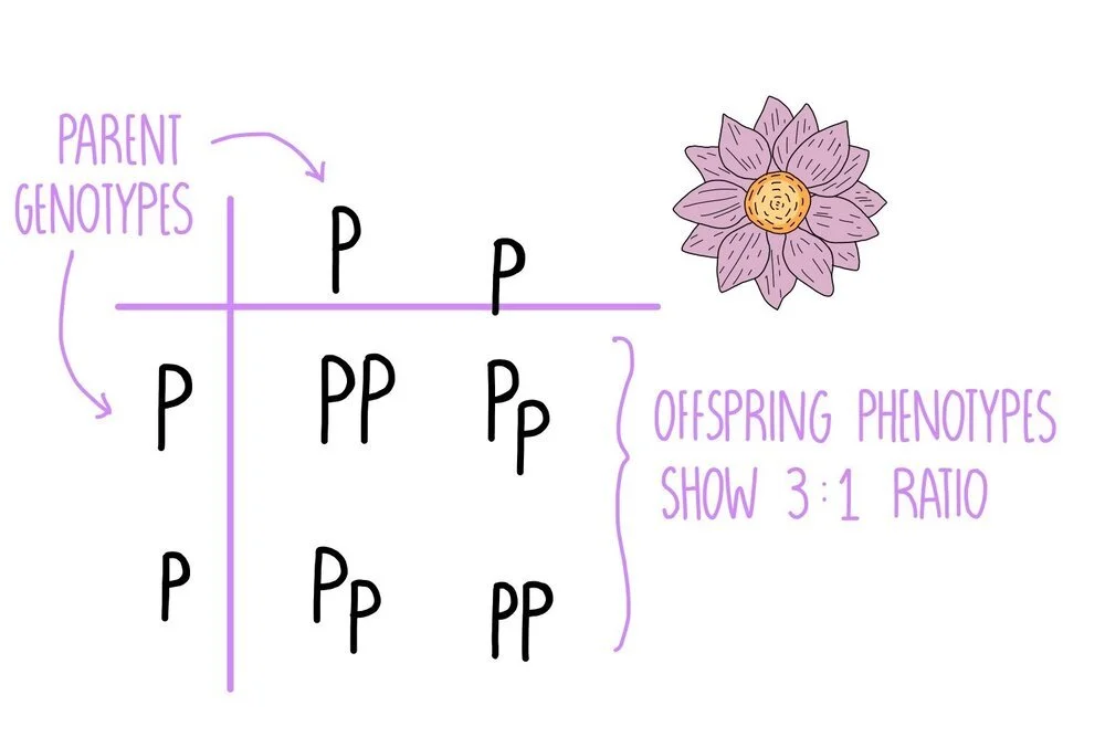 If the dominant P allele produces purple flowers and the recessive p allele produces white flowers, then we can see that breeding two heterozygous individuals will produce offspring with a 3:1 ratio of purple flowers to white flowers. This 3:1 ratio between the dominant phenotype and the recessive phenotype will always be seen in the offspring of two heterozygotes.