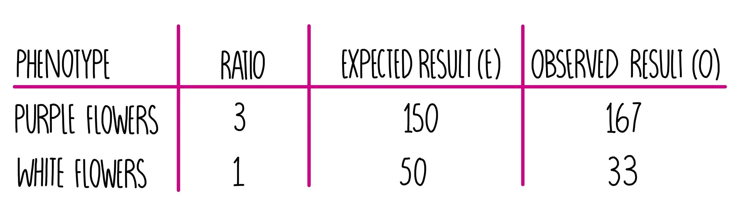 Let’s say you’re carrying out an experiment to determine the genotypes of two organisms for a particular trait. A gene which determines flower colour is controlled by 2 alleles - the dominant allele (P) gives rise to purple flowers and the recessive allele (p) produces white flowers. If two heterozygous purple flowers are crossed, we would expect to see a 3:1 ratio of purple flowers to white flowers in the offspring - these are our expected results.