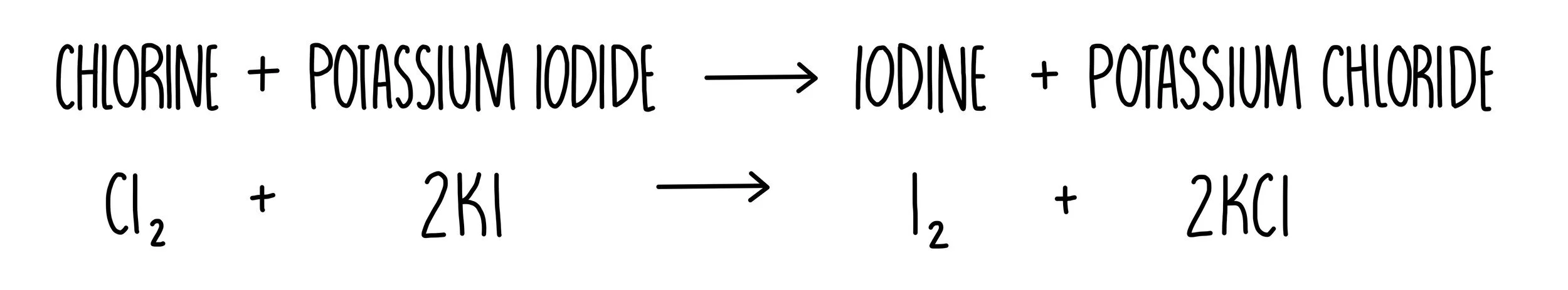 An example is the addition of chlorine to a solution of potassium iodide. Chlorine is more reactive than iodine so will take its place in the molecule, resulting in the formation of potassium chloride and iodine. The equation for the reaction would look like this: