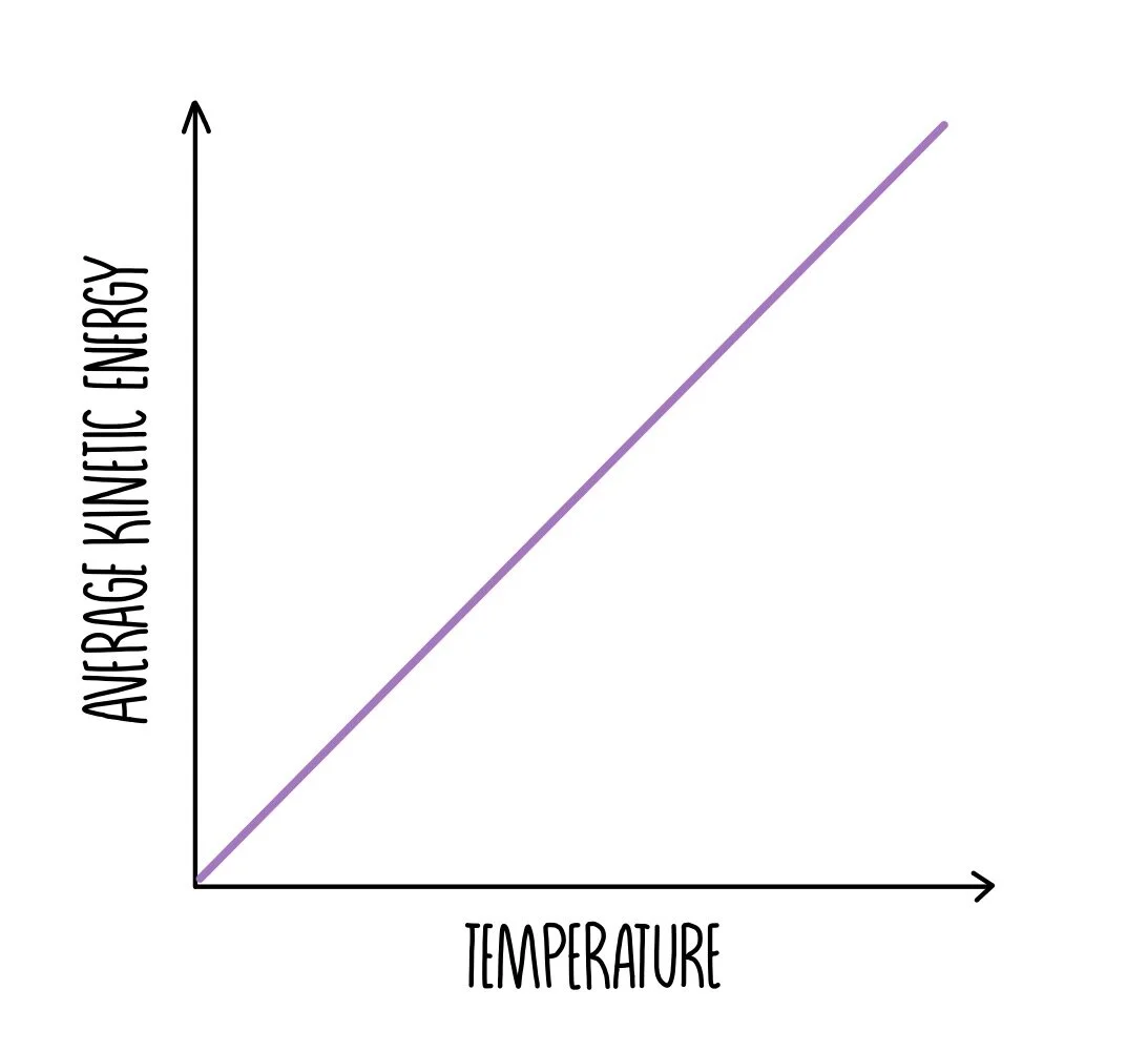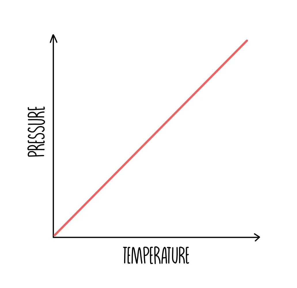 As temperature increases, the gas molecules have more kinetic energy. This is a proportional relationship which means that if we double the temperature, the average kinetic energy of the gas molecules also doubles. The gas particles are moving faster and will collide more frequently against the container walls and will do so with a greater force. This means that as temperature increases, the pressure of a gas also increases. Again, temperature and pressure are proportional, so if I double the temperature I will double the pressure.