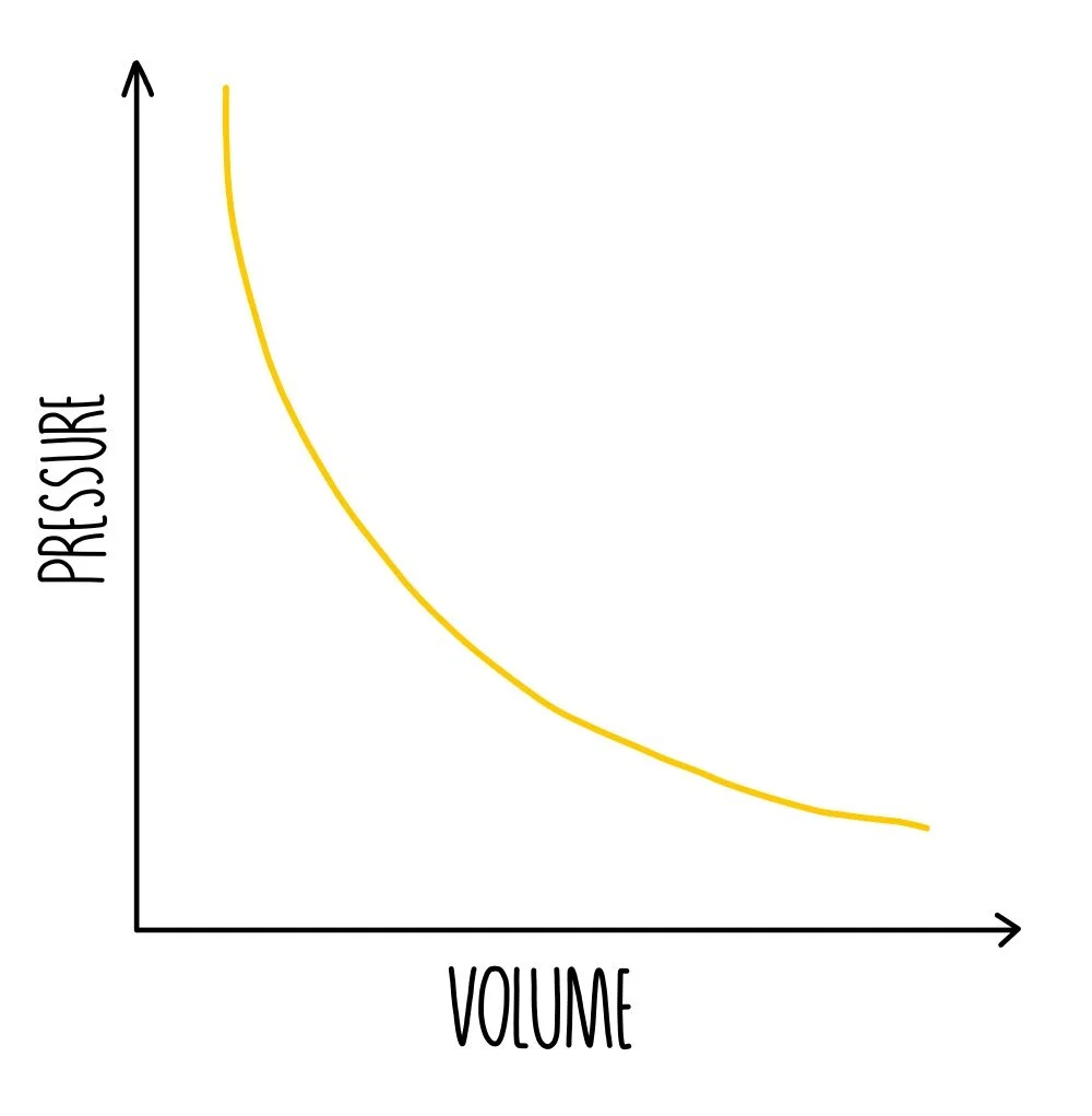 The relationship between pressure and volume is inversely proportional. This means that if we double the volume, the pressure of a gas is halved.