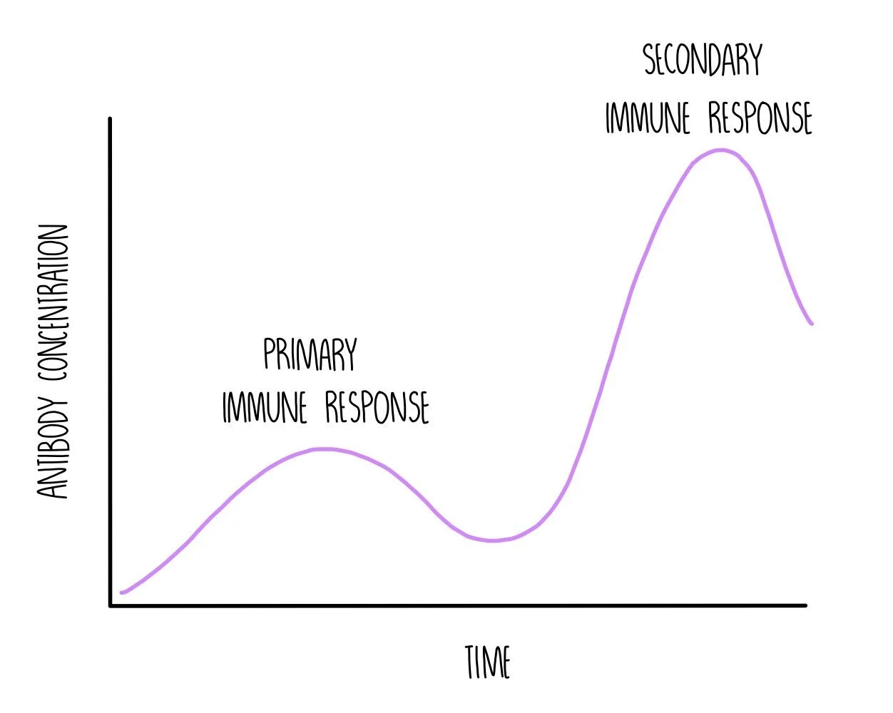 If you are re-infected with the same pathogen in the future, the T and B memory cells will recognise the antigen and start dividing. T memory cells will divide into the correct type of T killer cell to kill any cells that are infected with the pathogen. B memory cells will divide into plasma cells to produce a large number of antibodies which is complementary to the antigen molecules on the pathogen. This is the secondary immune response and is much quicker than the primary response. It happens so quickly that the pathogen is suppressed before you are able to experience symptoms - you are immune to the pathogen.