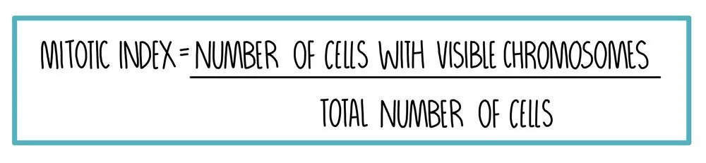 The mitotic index is a measure of the proportion of cells which are undergoing mitosis. You may be asked to calculate it in the exam. To do this, you need to count the number of cells with visible chromosomes and divide this by the total number of cells.