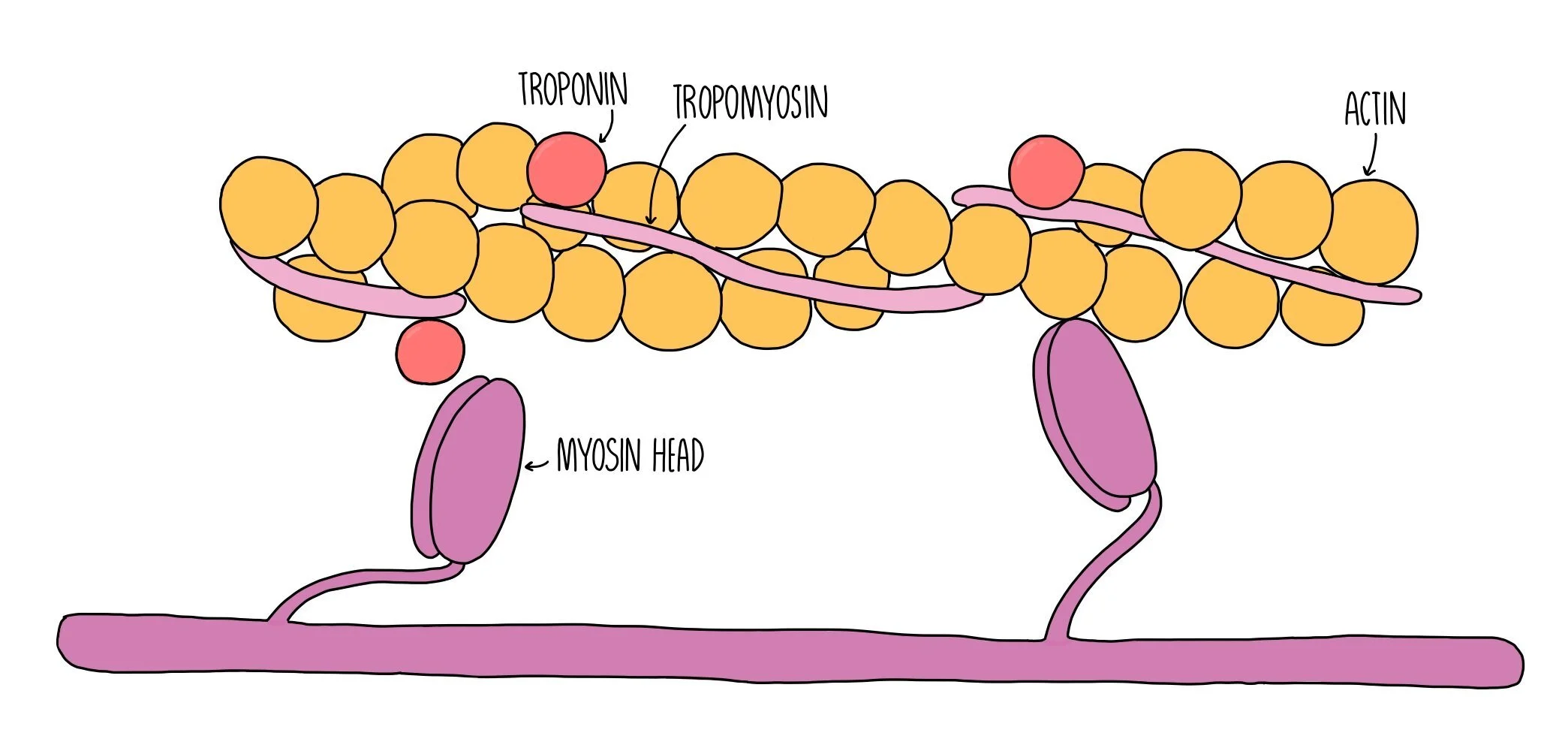 Myosin myofilaments possess head groups which contain binding sites for actin and ATP. Myosin heads are a globular and hinged, allowing them to move back and forth and enabling it to slide the actin filaments closer towards it. The region on actin where myosin binds is called the actin-myosin binding site. This binding site is blocked under resting conditions by two proteins called tropomyosin and troponin. When the muscle is not contracting, tropomysin covers the actin-myosin binding site and is held in place by troponin.