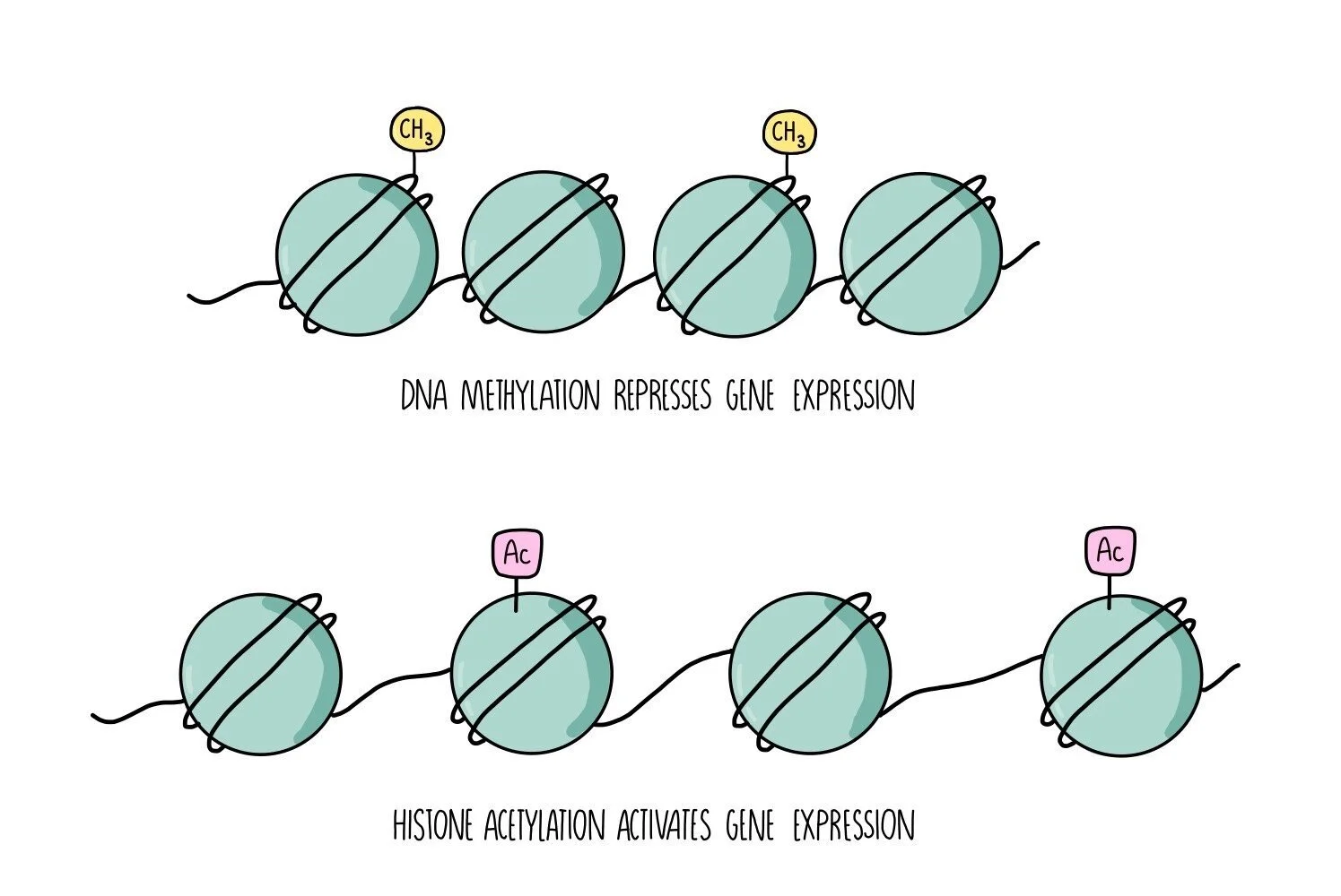 The addition or removal of epigenetic tags changes the structure of the chromosome, making it either more or less accessible to RNA polymerase, transcription factors and other proteins which are involved in transcription. The more open the structure of the chromosome, the more accessible it is to RNA polymerase - the gene is switched on. The less open the structure, the less accessible it is and transcription is reduced - the gene is switched off. The two main types of epigenetic ‘tags’ are methyl groups and acetyl groups.