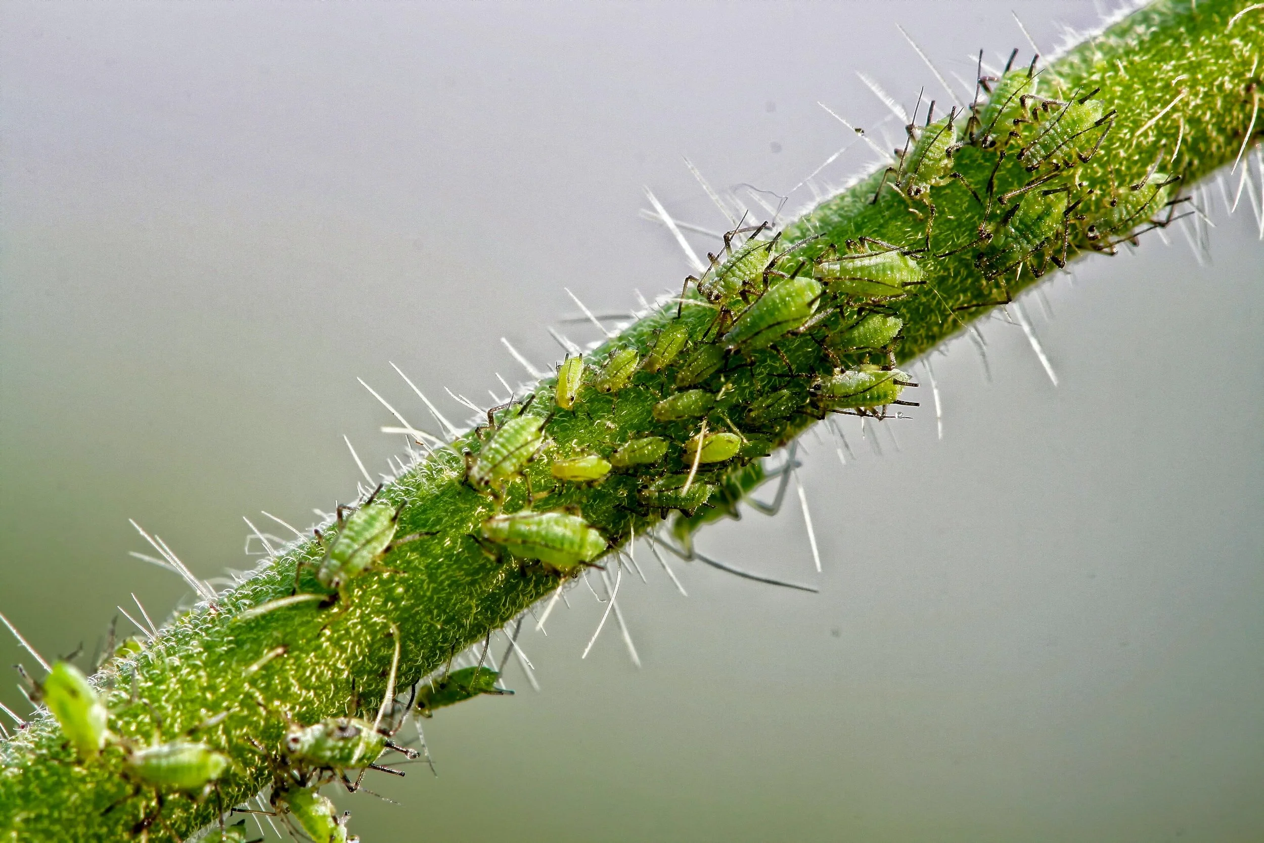 Aphids feeding on the sap inside a rose stem.
