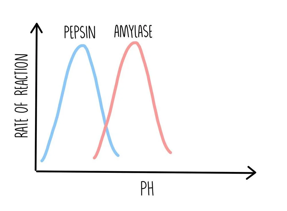 Each enzyme has its own optimum pH at which it works best. Pepsin, the enzyme which digests protein in the stomach, works best in acidic environments whereas the enzymes responsible for the digestion of carbohydrates work better at a more neutral pH. Deviations from the optimum pH change the charge on the enzyme, which affects ionic bonding within its structure. Deviations in pH also break hydrogen bonds. This causes it to change shape and become denatured, decreasing the rate of reaction as pH deviates from the enzyme’s optimum conditions.