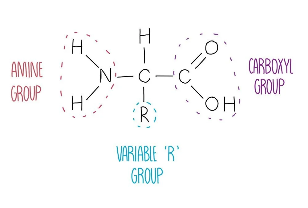 Proteins are polymers of amino acids joined together by peptide bonds. There are 20 different amino acids that our body needs to stay healthy, all of which have the same general structure. They consist of a central carbon atom attached to four different groups: an amine group, a hydrogen atom, a carboxyl group and an 'R’ group which is different in each amino acid. The identity of the R group will influence how the amino acid interacts with other amino acids, therefore influencing protein folding. For example, lysine has a charged R group and is able to form ionic bonds with negatively charged amino acids.