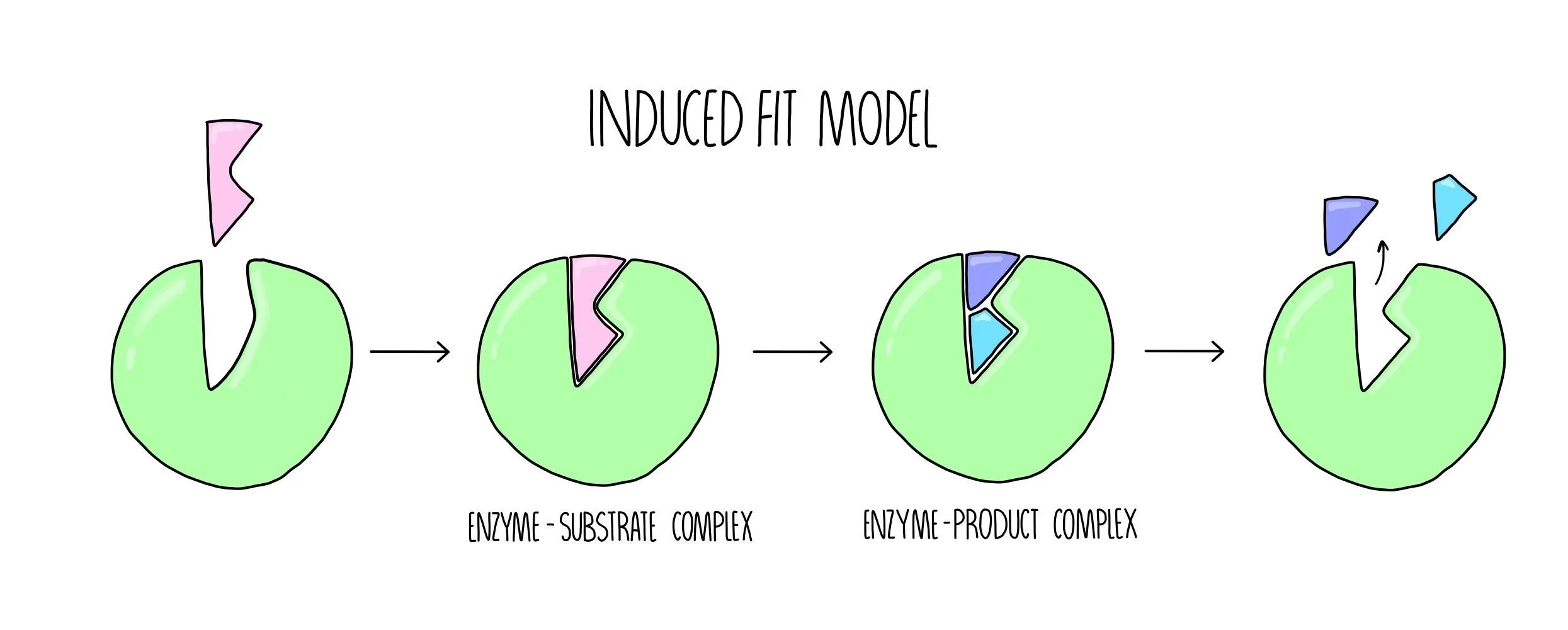 The induced fit model suggests that the shapes of the enzyme’s active site and its substrate are not exactly complementary, but when the substrate enters the active site, a conformational change (change of shape) occurs which induces catalysis. The induced fit model can be broken down into the following stages: