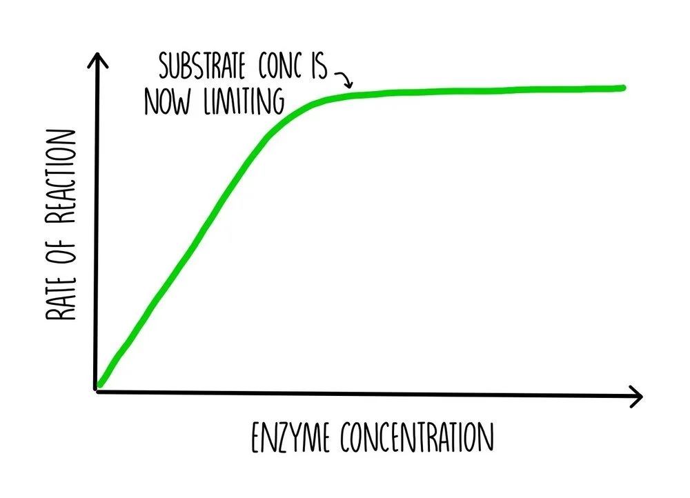 As enzyme concentration increases, the rate of reaction increases since more active sites will be available to bind to substrate molecules. This means that there will be more frequent collisions between the enzyme and substrate, so there will be more formation of enzyme-substrate complexes. However, a point will be reached when increasing enzyme concentration does not result in further increases in reaction rate. At this point, something else has become a limiting factor, such as the availability of substrate.