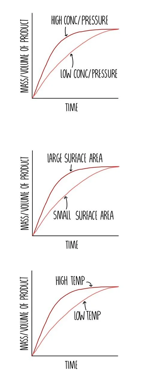 Concentration (for liquids) / pressure (for gases) – increasing the concentration or pressure means you have more reactant particles in a given volume, meaning there are more frequent collisions.