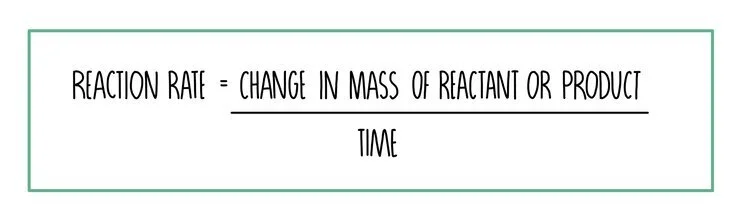 You can calculate the rate of reaction by dividing the change in the amount of reactant or product over time. For example, in a reaction where solid products are being converted into gases, you could measure how much mass of solid was lost in a given amount of time. Or you could measure the volume of gas formed in a given time.