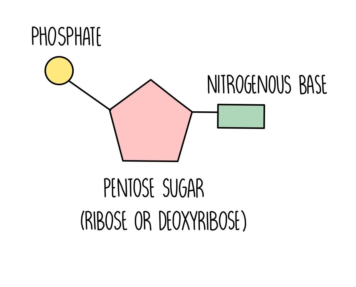 DNA is a polymer made up of long chains of nucleotides bonded together. Each nucleotide consists of a sugar, a phosphate group and a base. The bases present in DNA include adenine (A), thymine (T), guanine (G) and cytosine (C) where A always bonds to T and G always bonds to C. This happens because these pairs fit neatly together and we say their shape is complementary.