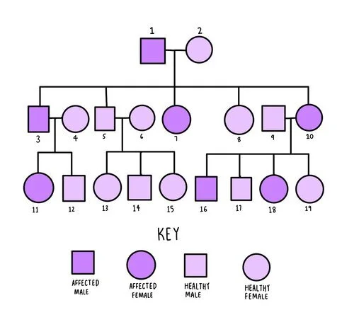 Pedigree charts show how genetic characteristics are passed on through generations. They are used by medical professionals to determine the probability of a family member inheriting a genetic disease. Different symbols are used for male, female, healthy and diseased individuals. Horizontal lines show two unrelated individuals who have reproduced, with the vertical lines representing their offspring. In the pedigree chart below, you can see that individuals 1 and 2 have had five children (individuals 3, 5, 7, 8 and 10).
