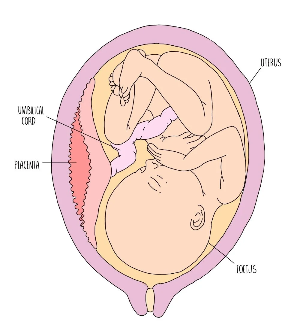 If the timings right and the stars are aligned, there is a chance that a sperm cell might just be lucky enough to meet and fuse with the ovum (egg cell) to produce a fertilised egg called a zygote. The zygote divides by mitosis into a ball of cells called an embryo which implants itself into the wall of the uterus. The embryo is surrounded by a liquid called amniotic fluid which cushions the baby and acts as a shock-absorber, protecting the embryo. A placenta also forms and is connected to the embryo through the umbilical cord. The placenta anchors the baby in the uterus and provides the developing embryo with substances (such as oxygen and glucose) as well as removing any waste products (like carbon dioxide).