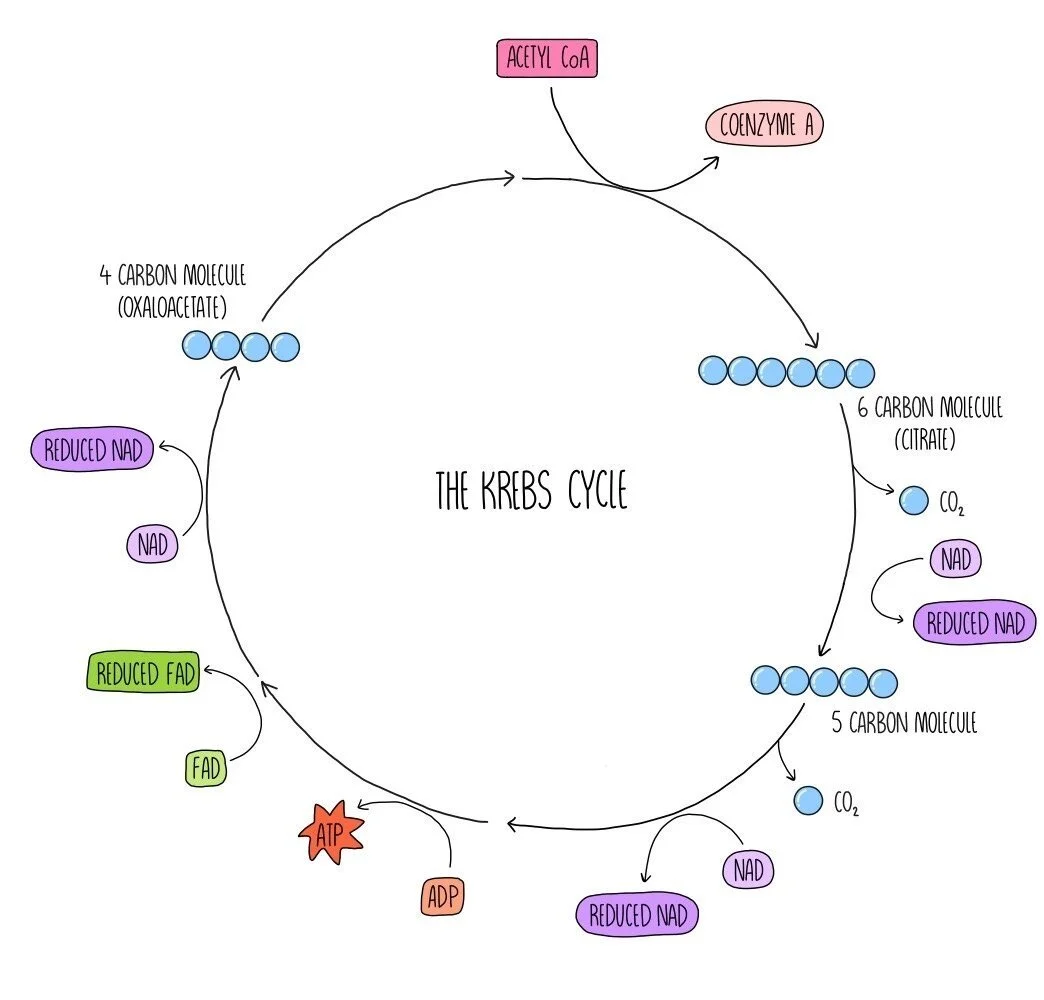 The Krebs cycle (also known as the citric acid cycle) is a series of reactions which generate reduced NAD and a similar molecule called reduced FAD which are needed for oxidative phosphorylation. Acetyl CoA from the link reaction reacts with a four-carbon molecule called oxaloacetate. The coenzyme A portion of acetyl CoA is removed and returns to the link reaction to be reused. A 6-carbon molecule called citrate is produced. Carbon and hydrogen are removed from citrate, forming carbon dioxide and reduced NAD. The citrate is converted into a 5-carbon compound. Decarboxylation and dehydrogenation occur once more, which converts the 5-carbon compounds into the 4-carbon molecule oxaloacetate which we started with. ATP, 2 molecules of reduced NAD, one molecule of FAD and carbon dioxide are also formed in this step. This cycle takes place twice for each glucose molecule that is respired aerobically.