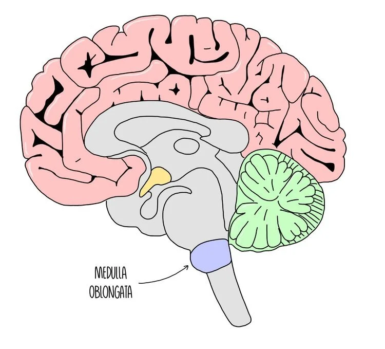 The medulla oblongata is a brain region found at the bottom of the brain, in the brain stem. It is involved in unconscious processes, such as controlling heart rate and breathing rate. A part of the medulla oblongata called the cardiovascular control centre is responsible for changing heart rate according to our body’s needs. It works by sending impulses along sympathetic or parasympathetic neurones which release different neurotransmitters onto the SAN - the SAN then modifies its rate of firing to slow down or speed up the heart rate.