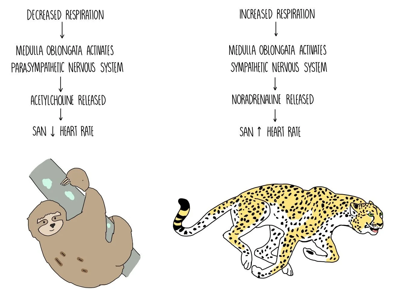 When the medulla oblongata receives signals from baroreceptors and chemoreceptors, it changes the rate at which the sino-atrial node (SAN) fires. If blood pressure or oxygen concentration is low, the cardiovascular control centre increases the rate of SAN firing through activation of the sympathetic nervous system. The sympathetic nervous system is involved in the ‘fight and flight’ response and increases heart rate through the release of a neurotransmitter called noradrenaline, which binds to receptors on the SAN. On the other hand, high blood pressure and high oxygen concentration causes the cardiovascular control centre to reduce the rate of SAN firing by activating the parasympathetic nervous system. This is involved in the ‘rest and digest’ response and decreases heart rate through the release of another neurotransmitter called acetylcholine. Acetylcholine binds to receptors on the SAN to slow down its rate of firing.