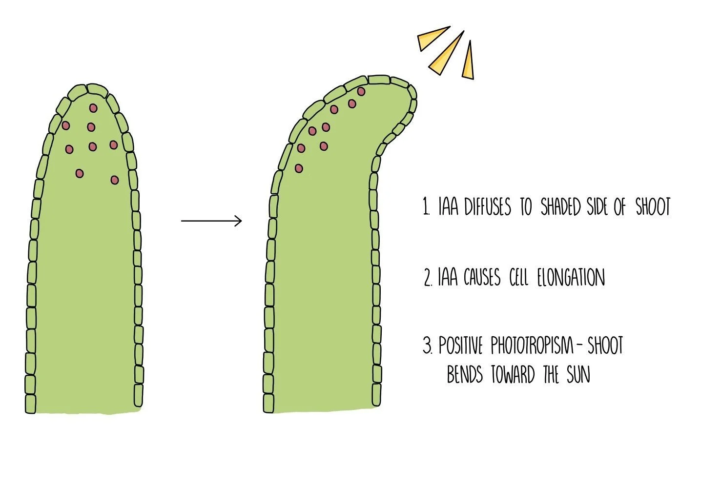 In shoots, IAA accumulates on the shaded part of the shoot where it activates genes involved in cell elongation. The activated genes are transcribed into proteins which make the cell walls looser and stretchier, causing the cells to become longer. The cells on the shaded side of the stem are longer than those on the sunny side, causing the shoot to bend towards the sun.