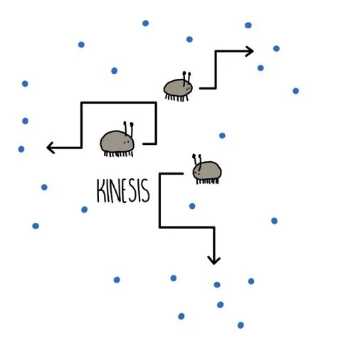 Kineses are movements in response to a non-directional stimulus. For example, woodlice display a kinetic response to humidity. When humidity is high, woodlice move around slowly and don’t change direction much. But when humidity drops, their pace speeds up and they change direction more frequently. This increases the chances that they will find themselves somewhere with more moisture in the air, increasing their chances of survival.