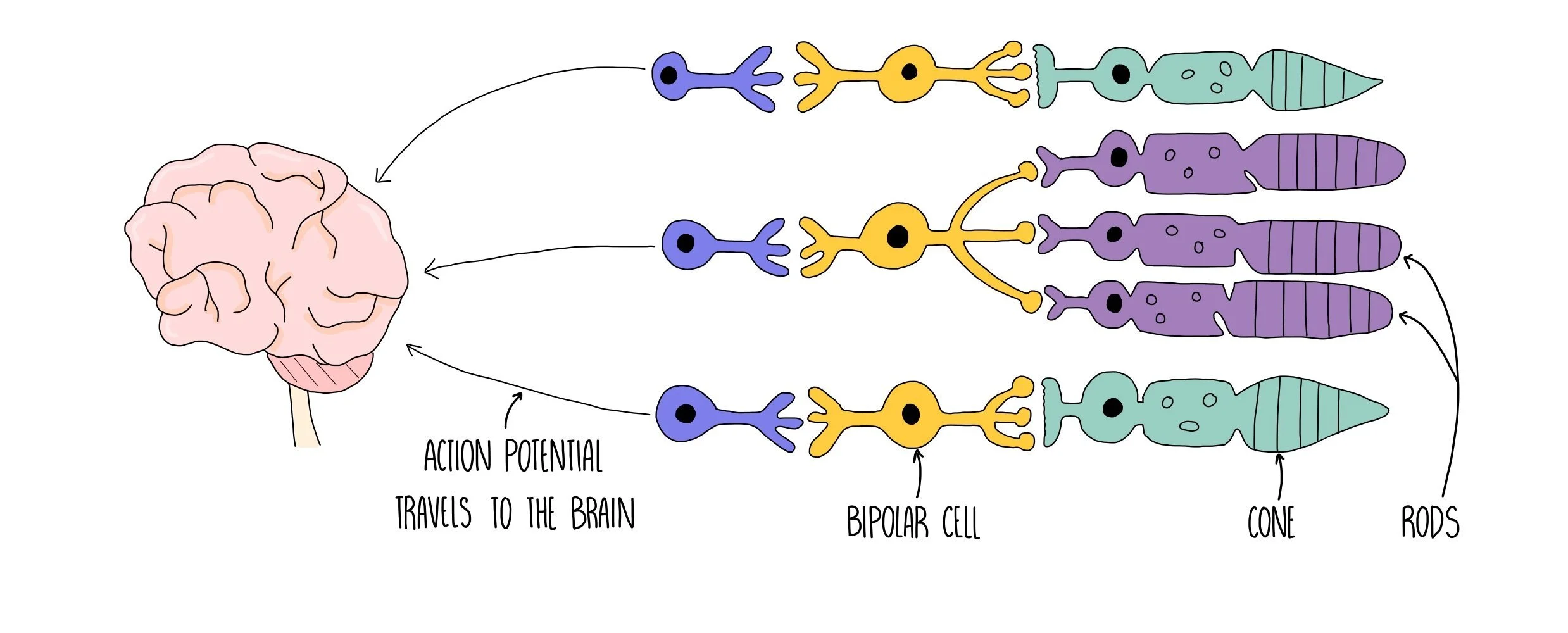 The bipolar neuron passes the impulse to the brain via the optic nerve.