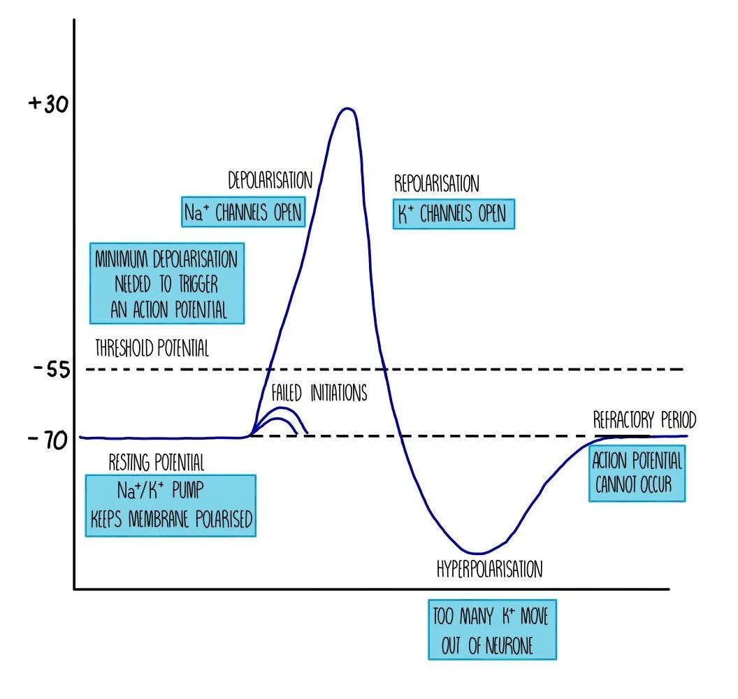 When a neurone is stimulated, the charge difference between the inside and outside of the cell membrane is lost and the membrane is depolarised. If enough charge is lost and depolarisation exceeds -55 mV, an action potential will occur in that neurone. The -55 mV ‘limit’ is known as the threshold potential - any depolarisation above this number will result in an action potential whereas anything less than that will result in nothing. We therefore refer to action potentials as an “all-or-nothing” response.