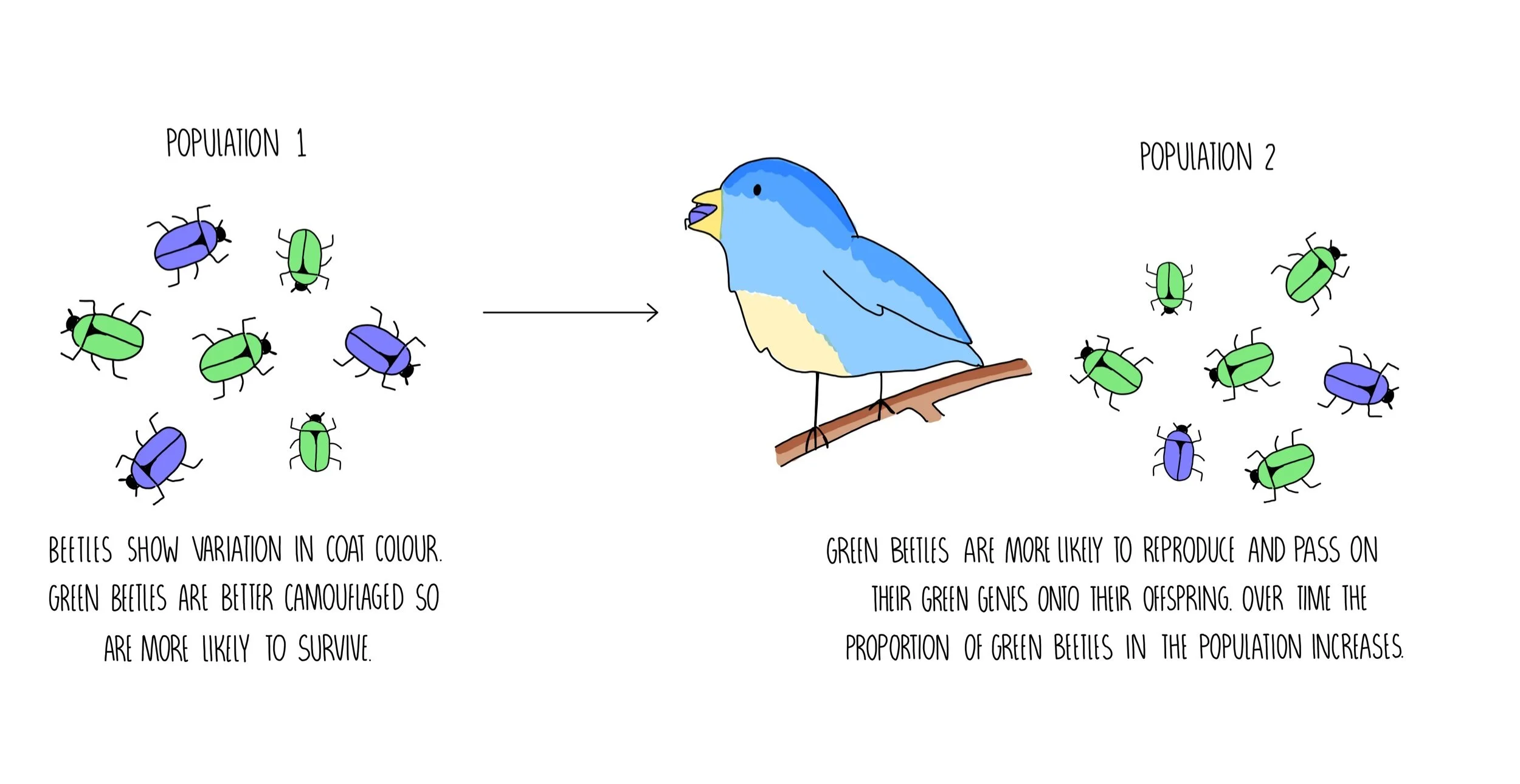 Charles Darwin proposed his theory of evolution by natural selection after studying animals living on the Galapagos islands in South America in the 19th Century. By observing living animals and fossilised remains, he noticed that features such as the beak size of finches increased over time. His theory can be summarised as follows:
